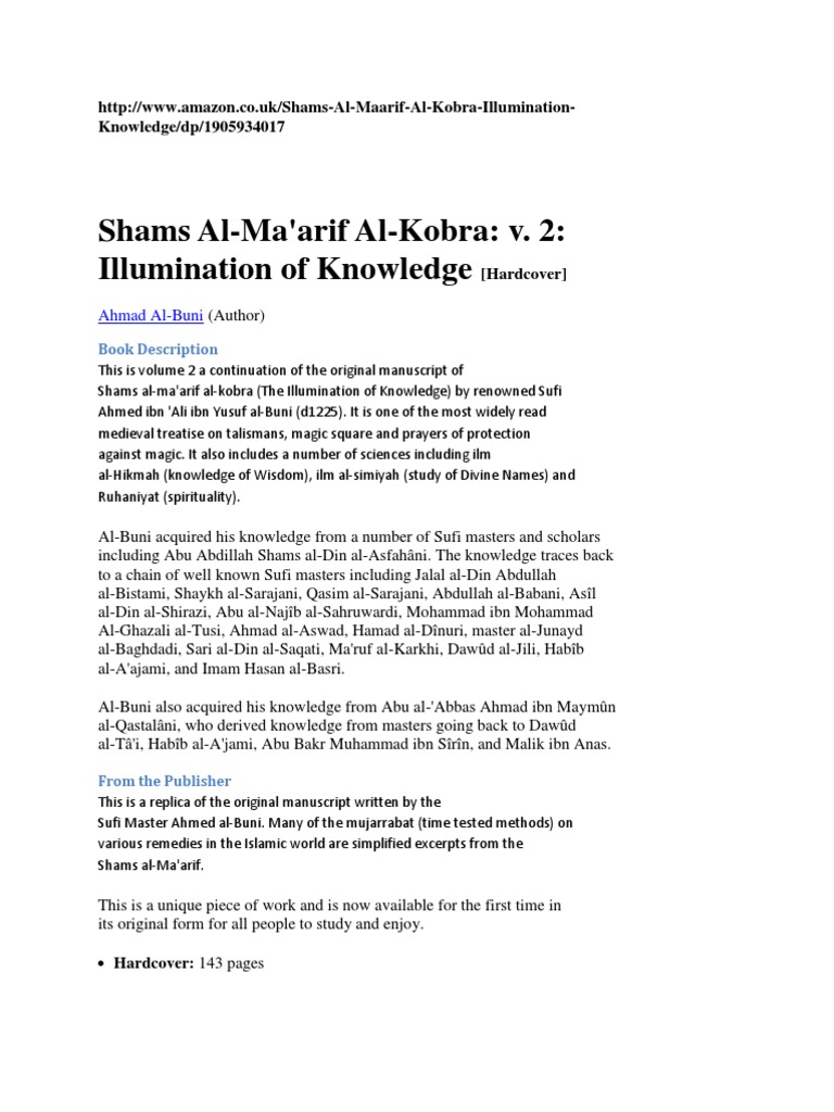 Shams al ma arif al kubra and shams al ma arif al sughra the former being the larger of the two. Shams al ma arif al kubra and shams al ma arif al sughra the former being the larger of the two. Shams al ma arif al kubra and shams al ma arif al sughra the former being the larger of the two. The shams al ma arif is generally regarded as the most influential textbook of its type in the arab world 1 and is arguably as important as if not more than the picatrix in both hemispheres.